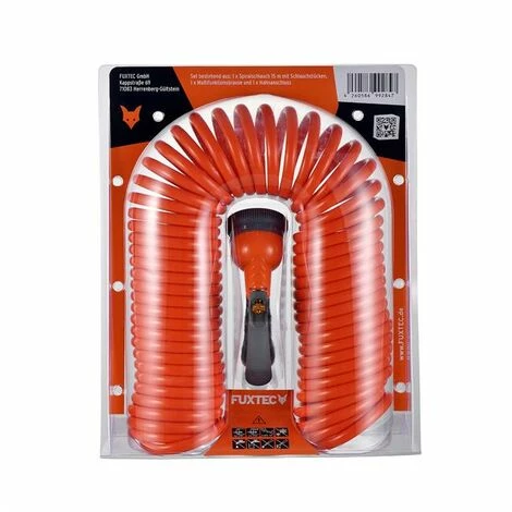 Durch die Natur der Schlauchspirale zieht sich der Schlauch nach dem Gebrauch automatisch in die Ausgangsform zurü ck – das spart nicht nur Platz sondern verhindert auch Stolperfallen. Das FUXTEC Komplett Set FX-SPS1 mit Multifunktionsbrause, Wasserstopp, Schlauchverbinder und Hahnanschlussstü ck. Mit einer Arbeitslä nge von 15 Metern beim FUXTEC Spiralschlauch gehö rt das Schleppen von Gieskannen der Vergangenheit an.